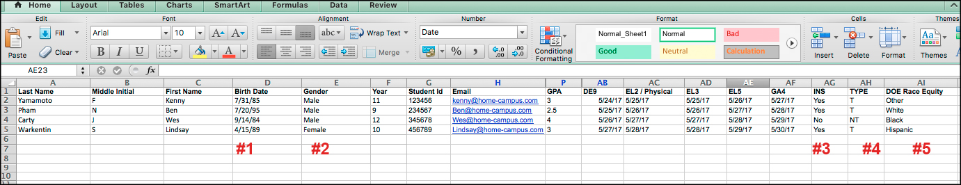 #1 Date - Formatting for the date must be 8/01/17 in order to import properly. This applies for all fields that may utilize the date, including, but not limited to Birthdate, DE9, EL2, EL3, EL5, and GA4.